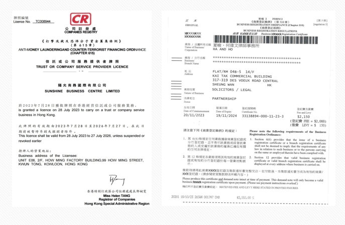 香港秘書公司及香港律所的營業執照